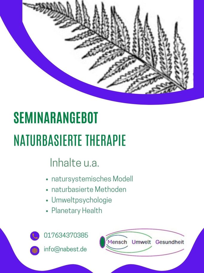 Im Seminar werden aktuelle Naturbeziehungsmodelle und Beispiele zur Anleitung von Naturerfahrungen vorgestellt. Teilnehmende werden ausgewählte Interventionen der naturbasierten Arbeit an eigenen Themen kennenlernen und reflektieren.